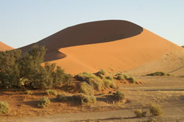Kurz nach 6 Uhr morgens sind wir schon im Park auf dem Weg nach Sossusvlei, 64km vom Tor entfernt. Auf halber Strecke erleben wir den Sonnenaufgang. Tut mir leid, aber die ganzen Farben und Stimmungen in den Dünen zu beschreiben, ist unmöglich. Ihr müsst das selbst erleben. Die letzten 5km zum Sossusvlei (Vlei = See) ist Luft in den Reifen ablassen angesagt, damit wir durch den Sand kommen. Hinten steigen wir auf eine der Sterndünen (Sterndünen, weil sich der Dünenkamm wegen der wechselnden Windrichtung verzweigt). Sie ist schätzungsweise 150m hoch und nach etwa 500m auf dem Kamm verlassen wir sie wieder. Ein eindrückliches Erlebnis. Eine Rundumsicht dort oben, vom feinsten. An den Dünenhängen wachsen kleine Sträucher bis fast nach oben! Unten liegen die Vleis, die seit Jahren kein Wasser mehr gesehen haben, trotzdem muss es im Untergrund noch feucht sein, denn auf dem Seeboden wachsen Pflanzen mit wunderschönen weissen und gelben Blüten. Zurück auf dem Camping gibt’s erst mal Pancakes. Später fahren wir zum Sesriem Canyon. Wow! Es geht etwa 30m nach unten, am Anfang ist die Schlucht sehr schmal und weist sogar einige Wasserlöcher auf, danach breitet sich der etwa 1km lange Canyon etwas aus und endet schliesslich in der Ebene, die wir am Morgen durchfahren haben. Hier unten ist es etwas kühler. Wie wir später erfahren, gehen die Angestellten vom Camping, wenn es extrem heiss ist, am Mittag in die Schlucht. Nach der Rückkehr geht’s erst mal in den Swimmingpool zum Abkühlen. Tut das gut! Obwohl es so heiss ist - bestimmt um die 42° - frieren wir wegen dem starken Wind beim Rauskommen. Schon total verrückt!