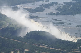 Um 14.30 Uhr werden wir zu unserem Rundflug mit Lenard über die Wasserfälle abgeholt. Wir haben die Ehre, vorne in der Pilotenkanzel zu sitzen. Wow, zuerst fliegen wir mitten durch die Schlucht des Sambesi, den Rückweg oberhalb der Ebene. Dann zu den Fällen. Sie sind 1,7km lang und bis zu 110m tief. Bei Trockenzeit ist auf der sambischen Seite kein Wasser, nur eine schwarze Steinwand, auf der simbabwischen Seite mehrere einzelne Fälle. Aber jetzt! Unglaublich diese Wassermassen.