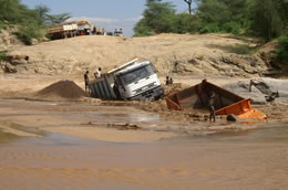 Nach weiteren Berichten von Chauffeuren müssen wir einsehen, dass das Omo-Gebiet für die nächsten Monate von der Versorgung abgeschnitten ist und wir machen uns um kurz vor 9 Uhr nach Omorate auf. Als wir vom Hotelhof rausfahren, hält uns der Polizeichef auf und wir spielen mal wieder Postbote, diesmal für den Polizeiposten in Omorate. Auf guter Naturpiste und nach 72km erreichen wir diesen Ort schon nach einer guten Stunde. Wir geben den Brief ab, dafür bringt uns einer der Polizisten zum Zollgebäude. Die Formalitäten sind in sagenhaften 15 Minuten erledigt. Danach noch etwas im Ort trinken und dann wieder 18km zurück, wo sich die Abzweigung nach Kenia befindet. Zum Glück gibt es nur einen Feldweg, der von der Hauptstrasse abgeht. Kein Mensch würde glauben, dass dies die Hauptstrasse nach Kenia ist. Wir durchqueren ein, Gott sei Dank, abgetrocknetes Flussbett nach dem anderen. Das breiteste ist um die 200m. Doch plötzlich, dumm gelaufen, stecken wir im Matsch fest. Doch Werner schafft es cm für cm rückwärts auf trockenen Boden zu kommen. Überall blühen gelbe und weisse Blumen. In einem Dorf machen wir Halt, ein Einheimischer mit dem gleichen Ziel wie wir, steigt zu uns ins Auto und hin und wieder kann er uns helfen, die Piste wieder zu finden, speziell wenn ein Teil der Piste vom vergangenen Regen weggespült wurde. Wahrscheinlich sind wir die ersten, die nach dem Regen diese Feuchtsavanne durchfahren. In der Ferne sehen wir schon den Turkana See, ehemals Rudolf See. Um 2 Uhr erreichen wir den kenianischen Polizeiposten in Illeret. Wir werden herzlich empfangen, die Zollformalitäten erstrecken sich darauf, dass er unsere Namen und das Autokennzeichen aufschreibt. In Nairobi müssen wir dann alles weitere erledigen. Sie haben seit den Belgiern in ihrem LKW (siehe 6.12.06) keine Touristen mehr hier gehabt; auch hier wegen dem starken Regen, doch sie sind der Meinung, dass die Weiterfahrt kein Problem für unser Auto sein kann, da wir den Weg hierher gut hinter uns gebracht haben. Und nun sitzen wir im Schatten auf dem Hof des Polizeipostens und lassen es uns hier bis morgen gut gehen. Der eine Polizist nimmt uns mit auf eine Ortsbesichtigung. Zur Zeit leben hier etwa 1.000 Menschen, davon sind die meisten vom Stamm der Dashnites. Hauptsächlich alte Menschen, Frauen und Kinder haben sich mit provisorischen Hütten hier für ein paar Monate eingerichtet, bis sie sich wieder ihren Männern auf Wanderschaft anschliessen. Als wir wieder zurückkommen, geht gerade Kennedy, der Polizeichef, mit 2 Wassereimern vorbei und ruft "I bring the bath for Claudia". Na, das ist doch was. Er zeigt mir die nicht funktionierende Dusche, darin ein kleines Becken zum Reinstehen und mit dem Eimer kann ich mich dann duschen. Nach der Hitze tut das äusserst gut. Nach dem Abendessen gesellt sich Ken noch zu uns auf ein Plauderstündchen. Da es hier keine Elektrizität gibt, ist der Sternenhimmel über uns einsame Spitze.